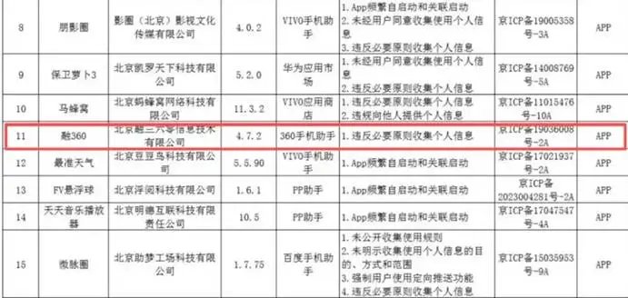 北京市通信管理局发布的《关于问题移动互联网应用程序的通报(2025年第八期)》中,点名了23款未完成整改的App,要求下架11款逾期未整改的应用,运营主体为北京融三六零信息技术有限公司的“融360”App因“违反必要原则收集个人信息”被点名。