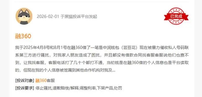 在黑猫投诉平台,有用户举报:“2025年4月8日、8月1日通过融360从中润钱包(芸豆花)借款,现在收到私人号码的暴力催收,还骚扰我的家人朋友,给我带来很大困扰,借款合同找不到,客服一直推脱,电话也打不通,融360平台收集的个人信息,泄露给了合作机构,致使本人及亲友受到恐吓侮辱。我要平台马上撤回我的个人信息,并且停止合作机构的暴力催收。”