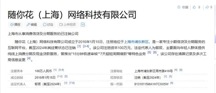 根据百度百科资料可知,随你花(上海)网络科技有限公司于2016年成立,注册资本为100万元,但其经营状态却标注为注销(截至2024年)。而小额贷款公司注销后,应由地方金融监管部门同步注销相关业务资质,不再从事放贷业务。