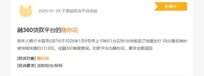 黑猫平台上有用户反馈:本人银行卡尾号(0874)2026年1月9号上午10时51分22秒与快钱签订快捷支付,随后莫名被快钱快捷扣款1318元,经融360客服查询,扣款平台是随你花,要求全额退款。