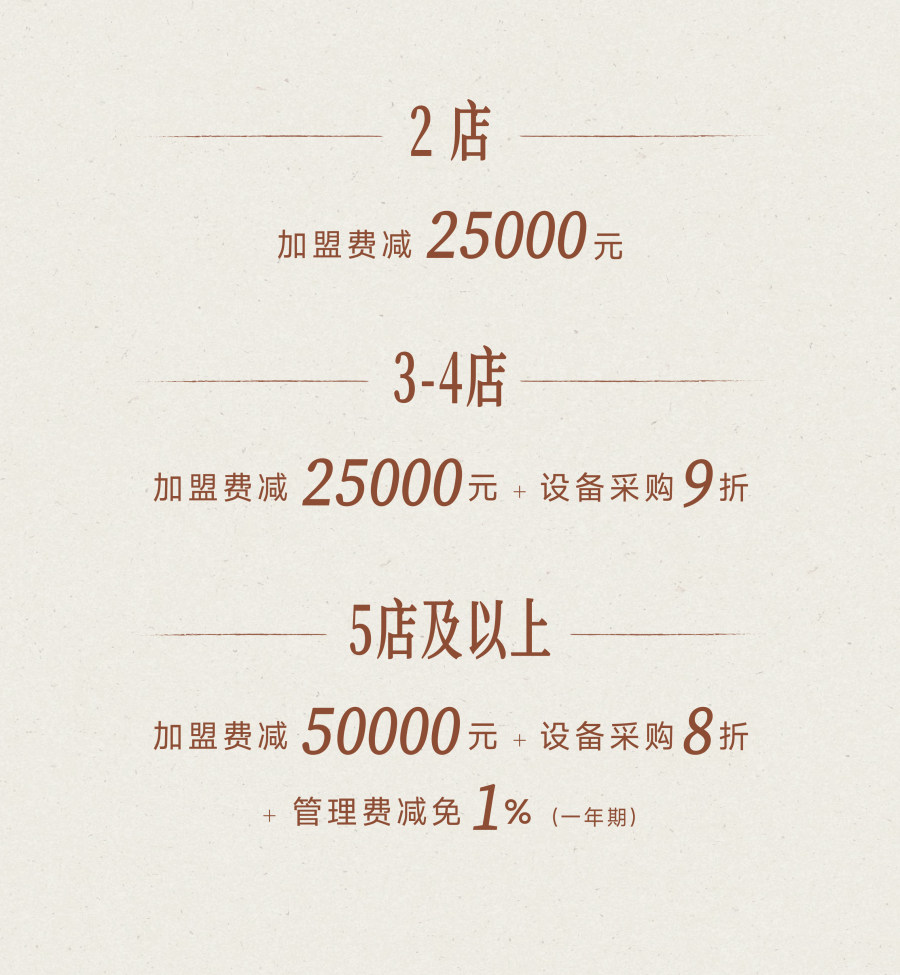 一是开多店阶梯优惠。加盟商开设第2家门店,单店合作服务费减2.5万,相当于打5折;第3-4店在单店合作服务费打5折的基础上,设备费用打9折;若开设第5家及以上门店,单店合作服务费全免,设备费用打8折,开店第一年的管理费用减1%。