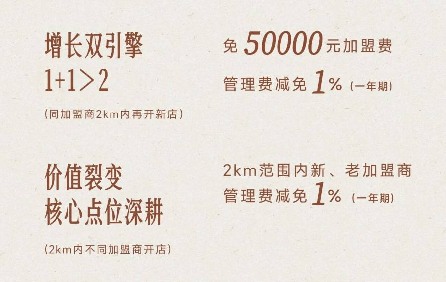 除此以外,若不同加盟商2公里内共开店,双方均能够减免第一年1%管理费。这对老加盟商是切实的收益激励,对新加盟商来说,可直接借鉴老加盟商的成熟经验,提升新店存活率。
