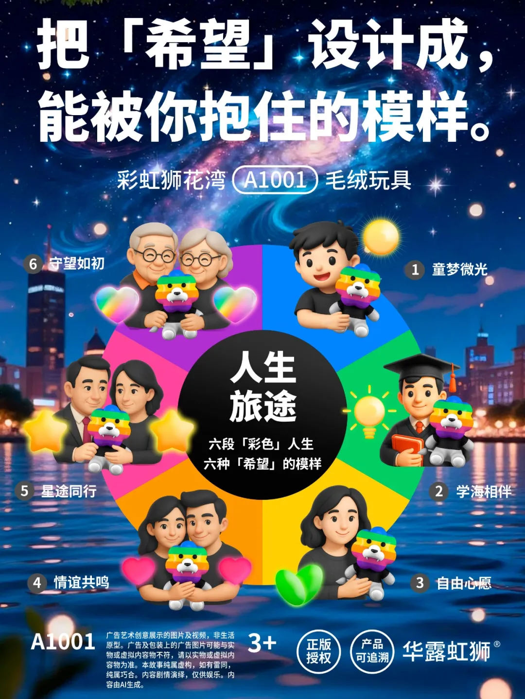童梦微光、学海相伴、自由心愿、情谊共鸣、星途同行、守望如初——这是我们为你描绘的六段彩色人生,也是「希望」在不同阶段的样子。「彩虹狮花湾」毛绒玩具,并不只属于某一个年龄段,他承载着跨越年岁的温柔与勇气,成为人生每一个时刻里可以依靠的存在。他不只是毛绒玩具,更是为人生每一段旅程准备的一份柔软支撑,一份始终不变的希望。