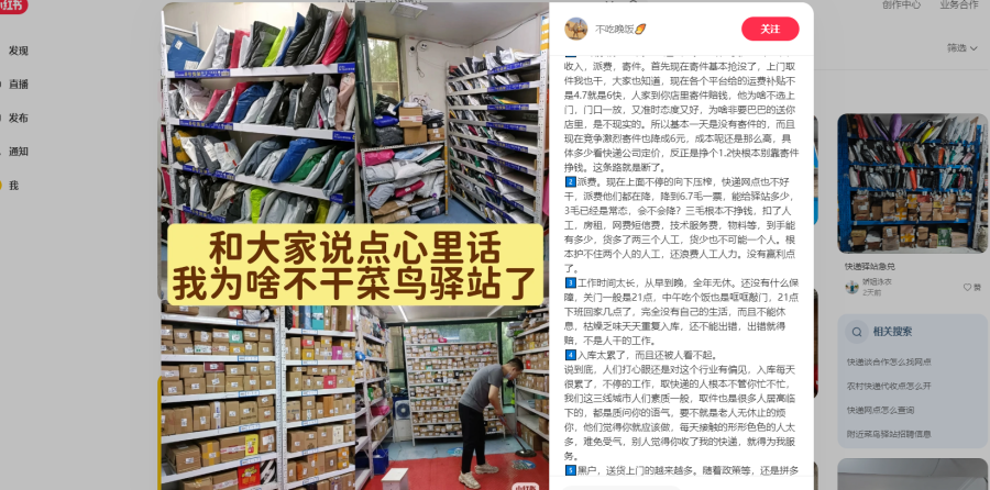 一位菜鸟驿站老板表示:“快递驿站挣钱的时代已经过去了,如今,来快递驿站寄件的人寥寥无几,大家更习惯上门取件,对快递驿站来说如果坚持上门取件,成本高,利润低,根本不挣钱。同样,在派件端,派费不断被压低,扣除人工、房租、技术服务费等固定开销,实际利润所剩无几。还让人头疼的是,一旦出错就要罚款。另外,工作时间又长,几乎全年无休,根本没有属于自己的时间。”