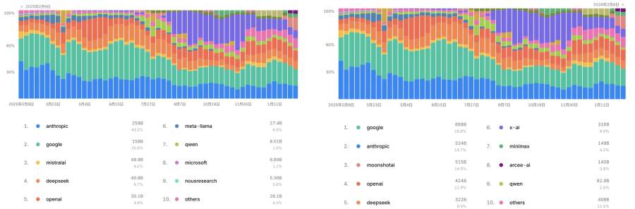 (图源:OpenRouter,对比日期:2025年2月8日/2026年2月10日)