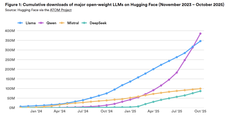 斯坦福大学“以人为本”人工智能研究院的一份报告显示,2025年9月,阿里巴巴的Qwen模型家族超越Llama,成为Hugging Face上下载量最高的LLM模型家族。2024年8月至2025年8月期间,中国开放模型开发者占Hugging Face总下载量的17.1%,略高于美国开发者的15.8%。与此同时,自2025年1月以来,基于阿里巴巴和DeepSeek发布的开放模型的衍生模型上传量超过了基于美国和欧洲主流模型的衍生模型。