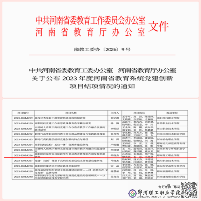 近日,省教育工委、教育厅公布全省教育系统党建创新项目结项结果,郑州理工职业学院校企合作处处长、就业创业中心主任胡俊杰主持的全省教育系统党建创新项目《高职院校岗位实习阶段学生党员教育管理和作用发挥机制研究》课题顺利通过专家评审,圆满完成结项验收。