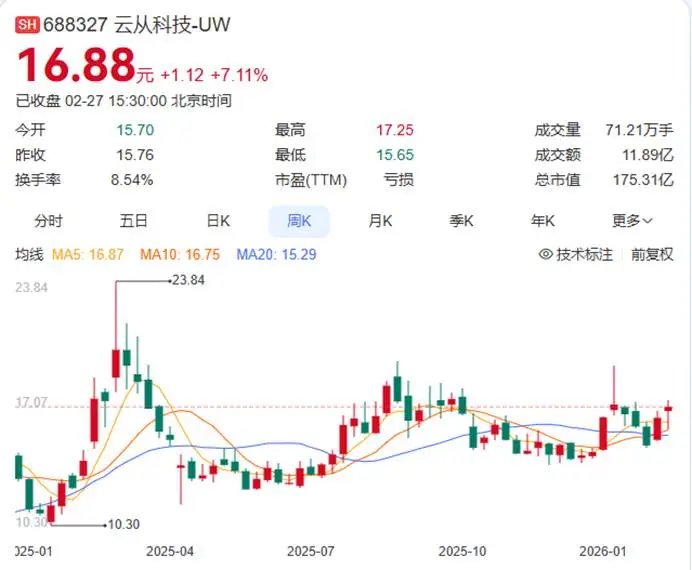 云从科技上市后曾被热捧,2023年4月7日的股价相较发行价累计涨幅达283.47%,当日收盘价为42.10元/股,市值不断上涨。不过之后的股价却一路“跳水”,到2026年2月27日时,股价在16元左右徘徊,远远低于此前的高点,市值也大幅缩水。