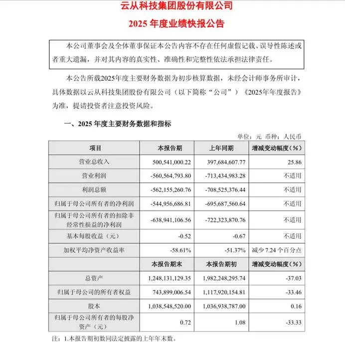 图源:云从科技2025年度业绩快报公告