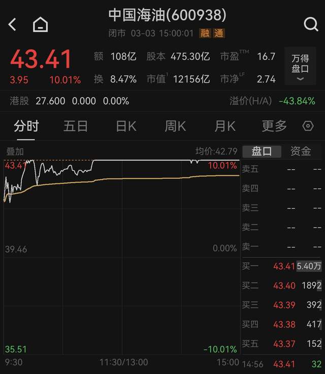 3月3日,中国海油以43.41元涨停价收盘,市值突破2.06万亿元,创下2022年A股上市以来新高,两日累计成交额接近180亿元,巨量资金涌入,推动这家深海能源巨头迈入2万亿市值俱乐部。
