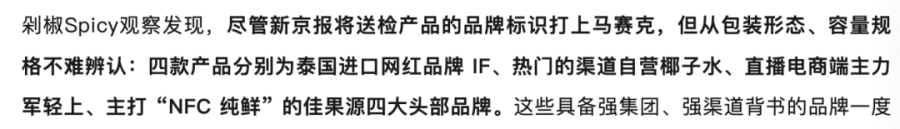 在行业还是质疑被打上马赛克的四款产品属于哪几家时,国内知名自媒体剁椒Spicy观察在其媒体上对行业表示,尽管新京报将送检产品的品牌标识打上马赛克,但从包装形态、容量规格不难辨认:四款产品分别为泰国进口网红品牌 IF、热门的渠道自营椰子水、直播电商端主力军轻上、主打 “NFC 纯鲜” 的佳果源四大头部品牌。