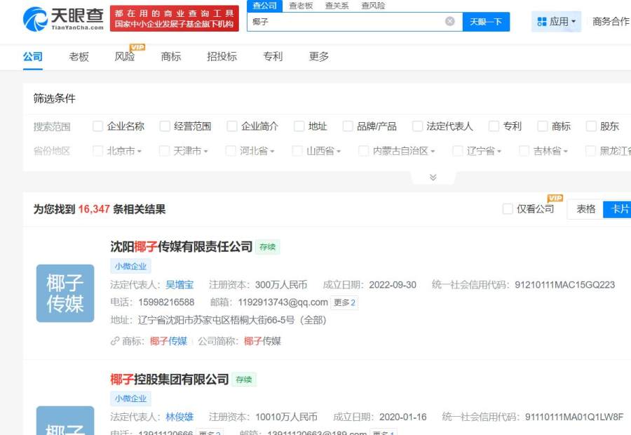 天眼查APP显示,搜索椰子相关公司名称,就高达一万多条,这还不算一些饮料类业务拓展的椰子汁业务。