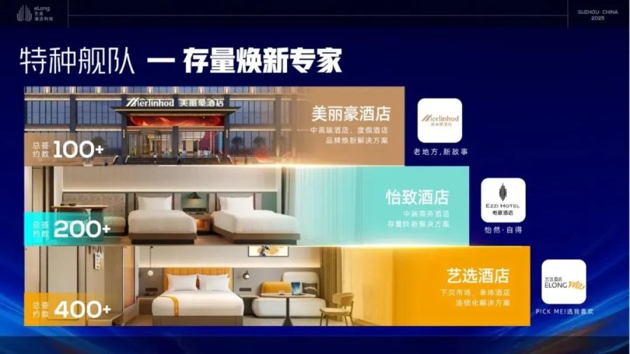 2025年,艺龙酒店科技正式推出美丽豪酒店、怡致酒店与艺选酒店三大存量焕新品牌,分别针对中高端全服务、中端商务、下沉市场轻中端三种不同需求。