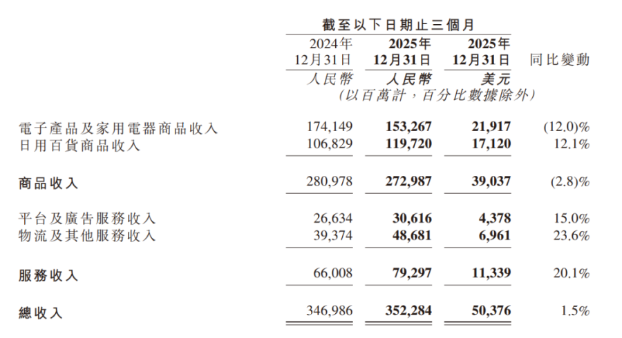 日用百货的表现平衡了这种落差。日用百货收入连续 5 个季度双位数增长,全年增速 15.3% 占商品收入比例超四成,Q4 增速 12.1%。同步的,服务收入全年同比增长 23.6%,其中平台及广告服务收入,全年增速达到 18.9%。