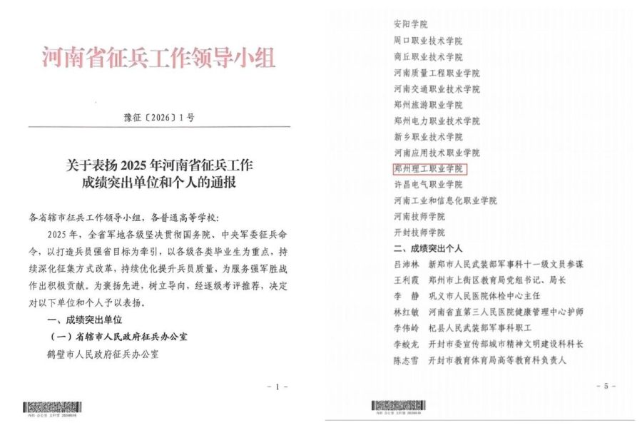 近日,河南省征兵工作领导小组印发《关于表扬 2025 年河南省征兵工作成绩突出单位和个人的通报》,对全省征兵工作先进典型予以表彰。郑州理工职业学院荣获“2025 年河南省征兵工作成绩突出单位”荣誉称号。