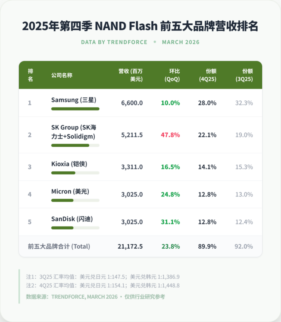 三星、SK海力士、美光、西部数据、铠侠这些原厂,几乎同时收紧资本开支,主动减产控货,NAND端前五家厂商合起来拿走了超过90%的市场份额,DRAM端三家企业就吃掉了95%以上的盘子,这种集中度下,只要头部几家一致动作,行业周期的节奏就已经定了大半。