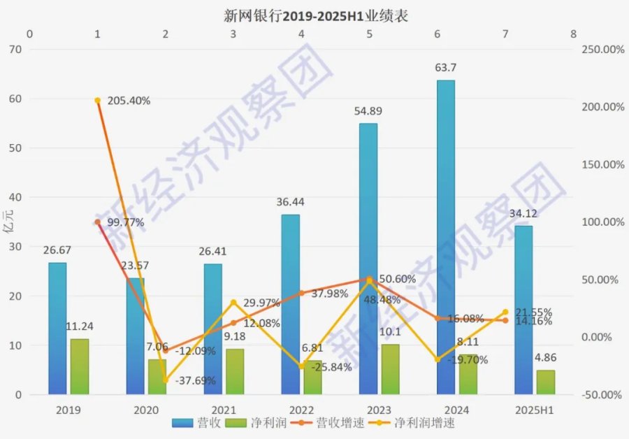 到了2025年上半年,新网银行资产总额为1056.96亿元,较年初上升了1.99%;负债总额为972.57亿元,较年初上升了1.65%。同期新网银行实现营收34.12亿元,同比上升14.16%;净利润为4.86亿元,同比上升21.55%。尽管还在保持稳健增长,但增速早已大不如前。