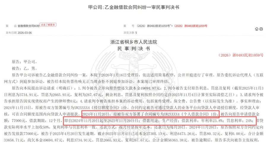 而裁判文书网的裁判文书也证实了新网银行擦着24%利率放款的事实。《(2026)浙0483民初1059号》显示,2024年11月20日,新网银行与被告双方签署了合同编号为XW2XXXX4《个人借款合同》1份,被告向原告申请借款金额77000元,借款期限12个月,借款用途为生产经营;借款利率为年利率23.8%;罚息利率24%,即贷款实际利率水平上加收50%,复利利率与罚息利率一致。