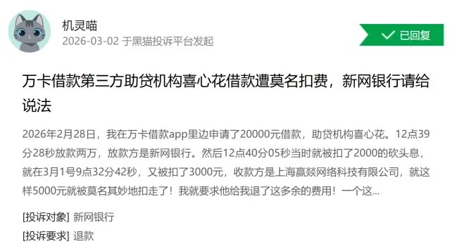 目前黑猫投诉上针对新网银行的投诉量达到9400多个,涉及到催收、利率、收费等方面的问题,还有多个帖子提到金瀛花、万卡等平台的放款方也是新网银行,但这些并不在新网银行的合作名单当中。