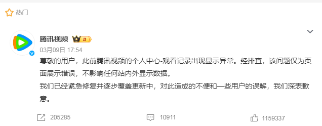 腾讯视频于3月9日作出回应,平台方面表示:“尊敬的用户,此前腾讯视频的个人中心-观看记录出现显示异常。经排查,该问题仅为页面展示错误,不影响任何站内外显示数据。我们已经紧急修复并逐步覆盖更新中,对此造成的不便和一些用户的误解,我们深表歉意。”