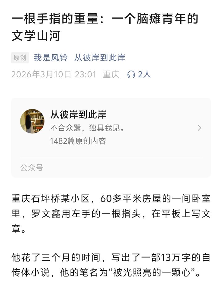 今晚阅读了,社交平台推出「从彼岸到此岸」2026年3月10日发布的原创纪实文章《一根手指的重量:一个脑瘫青年的文学山河》,作者实地走访重庆九龙坡区石坪桥小区,真实记录24岁痉挛性脑瘫青年罗文鑫以单指创作13万字自传体小说、谱写多首原创歌词的生命历程故事。