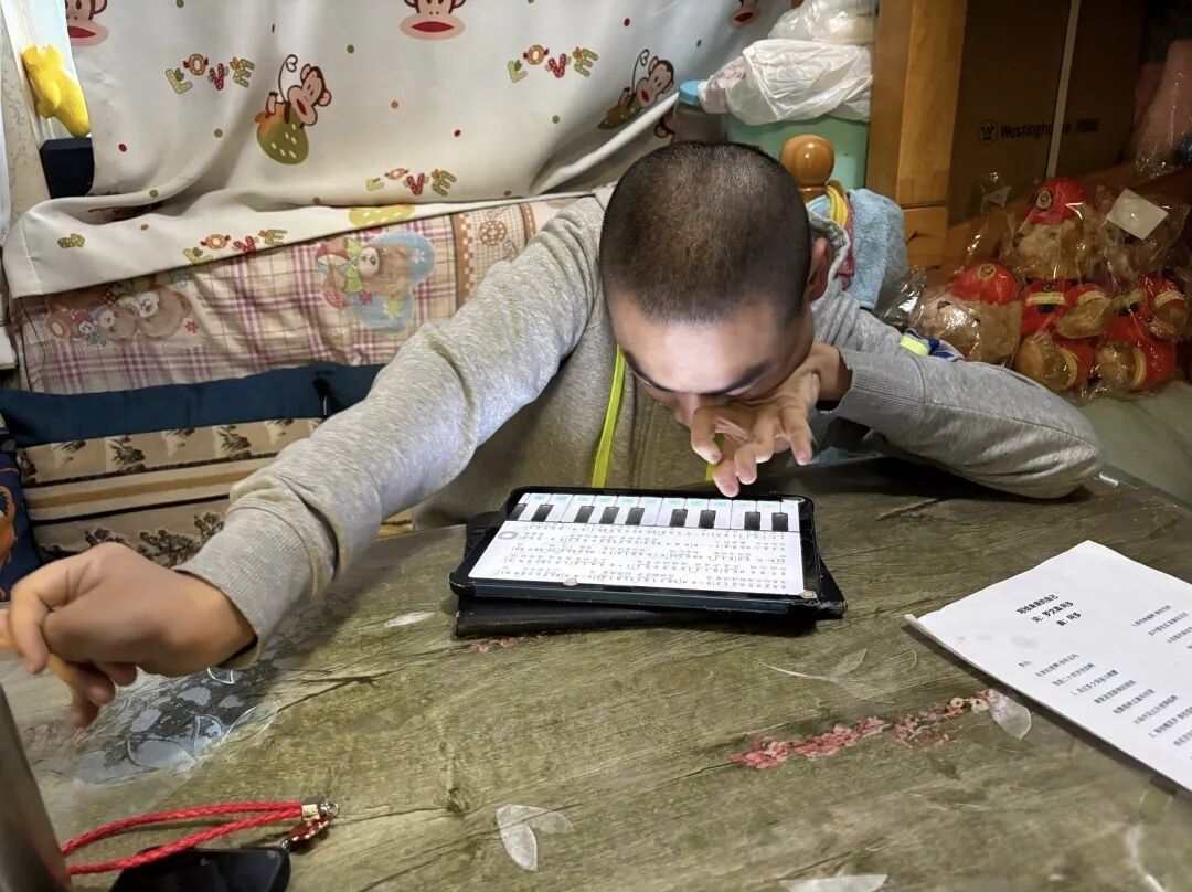 他为消防员写《消防之光》,为母亲写感恩之歌,为自己写《写给未来的自己》,这些歌词,是他对善意的回馈,是他对生活的热爱。当旋律在小屋里循环播放,他轻声合唱,字句不清,却满心欢喜——艺术让他插上了翅膀,方寸小屋,成为他梦想的舞台;一根手指,谱写着生命的乐章。