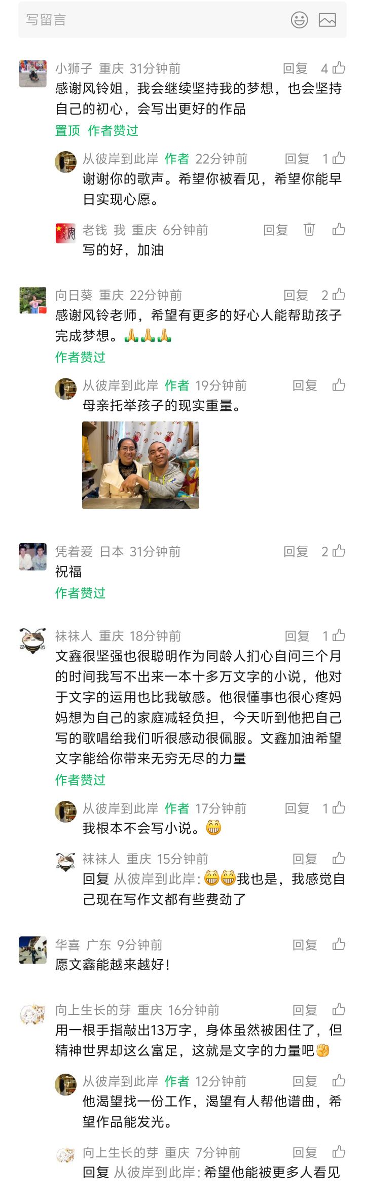 读完这篇文章,我被罗文鑫的坚韧照亮,被母亲的大爱感动,被人间的善意温暖。他的故事,是重庆烟火里的一束微光,是中国大地上凡人生命的缩影。它让我们相信,哪怕被命运亏待,依然能找到属于自己的光;哪怕身处深渊,依然能仰望星空;哪怕只有一根手指,依然能擎起属于自己的文学山河。