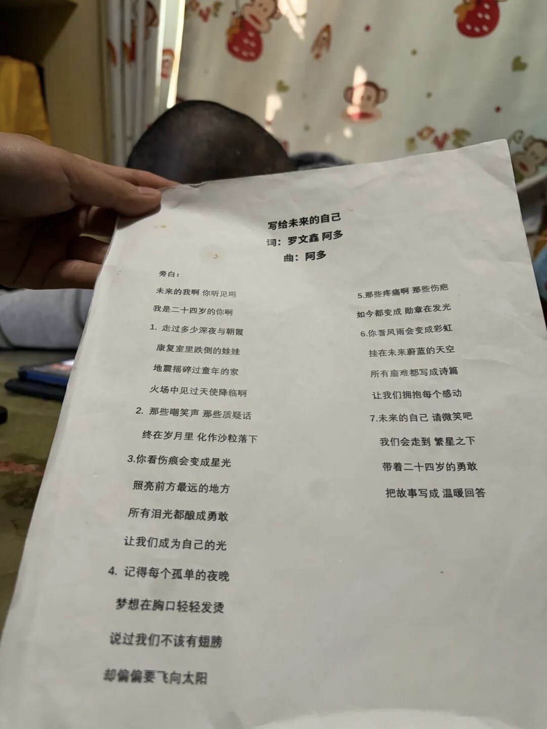罗文鑫的生命里,不仅有母亲的大爱,还有无数凡人的微光,这些细碎的善意,汇聚成照亮他前路的星河。亲戚赠送的平板,是他接触世界的窗口;邻居借出的网络,是他学习知识的桥梁;写作朋友的改稿指导,是他文学之路的引路人;音乐人阿多义务为歌曲谱曲,推荐同行演唱,让他的歌词化作旋律,飞向远方;社区的关怀、低保的保障,让这个拮据的家庭,有了最基本的生活支撑。
