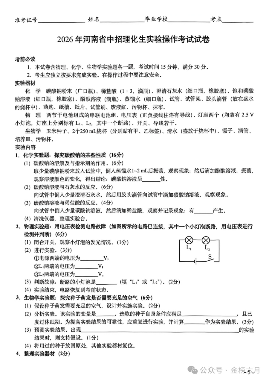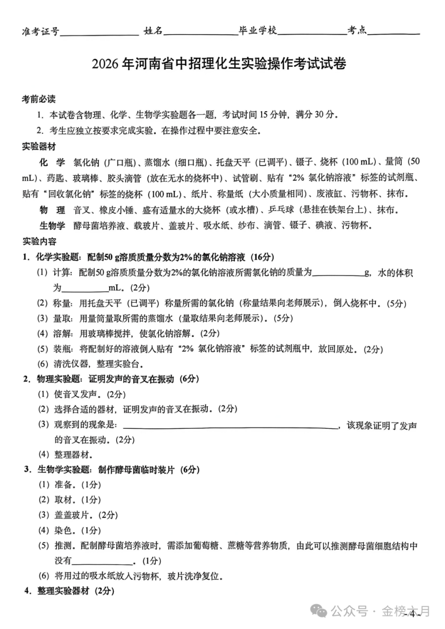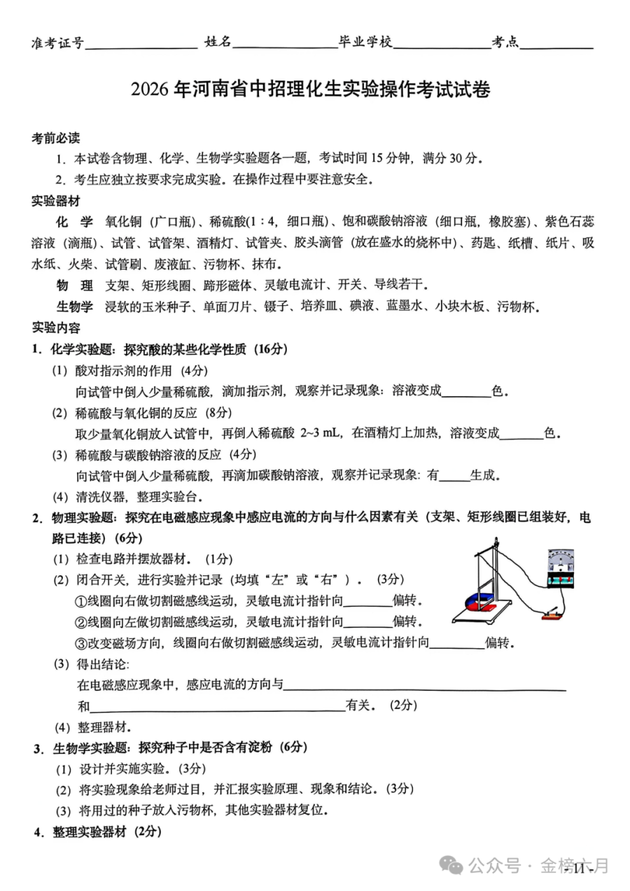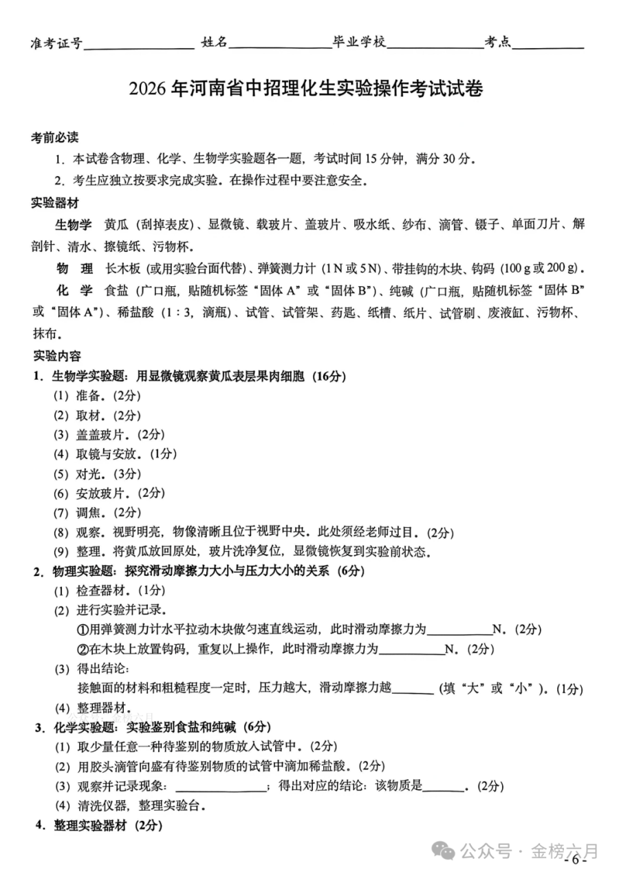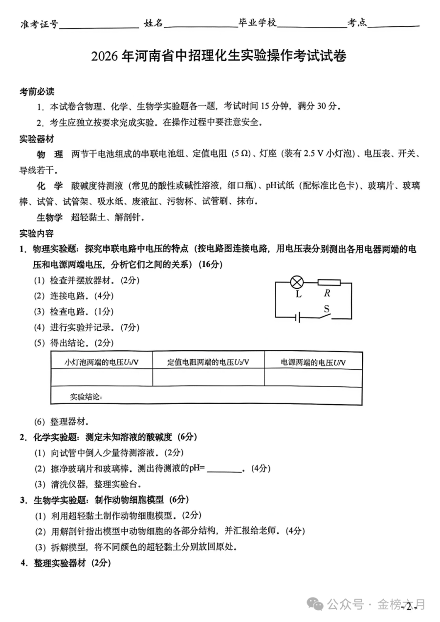 2026年河南省中招理化生实验操作考试(CD)试卷+评分表+满分攻略!