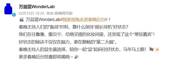 在刚刚过去的2026年春节,如果关注过央视春晚后台花絮,大概率会看到一抹“克莱因蓝”;万益蓝凭借“春晚主持人都在吃”等话题出圈,其小蓝瓶益生菌被描述为后台的“健康搭子”。此外,在2026天猫“益生菌热卖榜·开门红”榜单同步出炉,万益蓝占据前三席位中的两席,市场销量可见一斑。