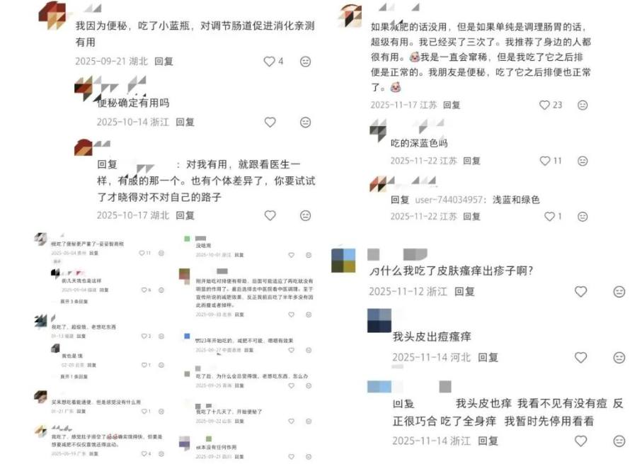 在社媒平台上,关于万益蓝产品效果的声音并不一致。有网友表示,“我因为便秘,吃了小蓝瓶,对调节肠道促进消化亲测有用”;但也有不少网友则直呼失望与质疑,“没有任何作用”“妥妥智商税”,甚至有网友称其在服用后出现皮肤瘙痒、起痘、腹泻恶心等症状。