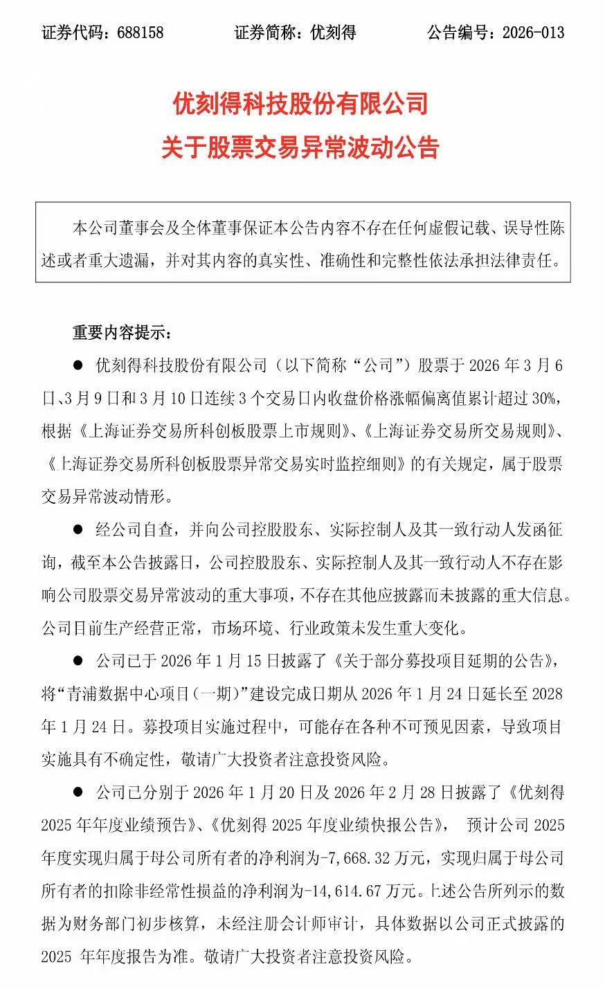 2026年3月10日晚间,优刻得(688158)发布股票交易异常波动公告,公司股票在3月6日、3月9日、3月10日连续三个交易日内,收盘价格涨幅偏离值累计超过30%,触及科创板异常波动标准。
