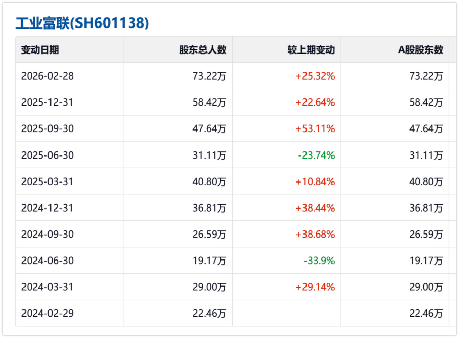 截至最新报告期,工业富联股东人数已飙升至73.22万,不到一年即翻倍,仅过去两个月,就又多了25%的人来抄底。