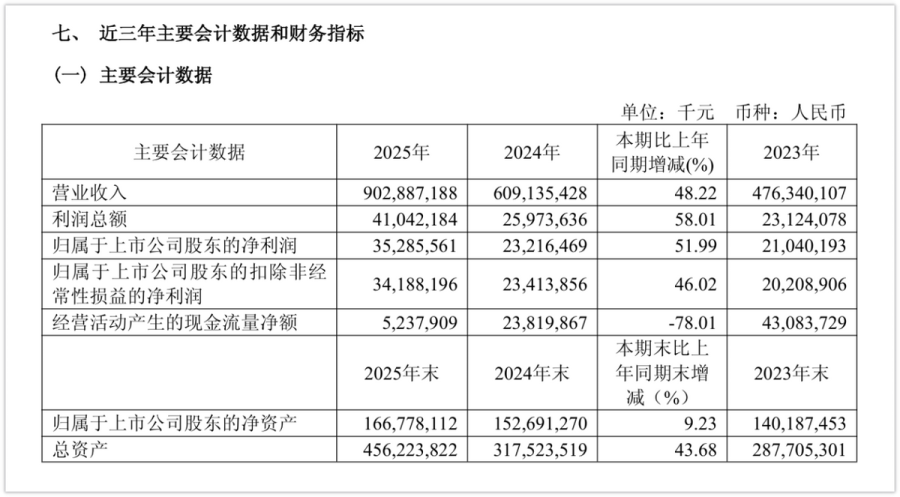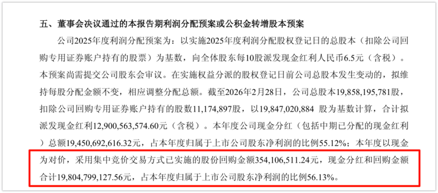 年报显示,其全年营收9028.87亿元,同比增长48.22%;归母净利润352.86亿元,同比增长51.99%;扣非净利341.88亿元,同比增长46.02%;ROE达到21.65%,创上市以来新高。尤其是年度现金分红(含中期)合计194.51亿元,分红率55.12%,连续4年百亿级派现,累计派现已达631亿元。