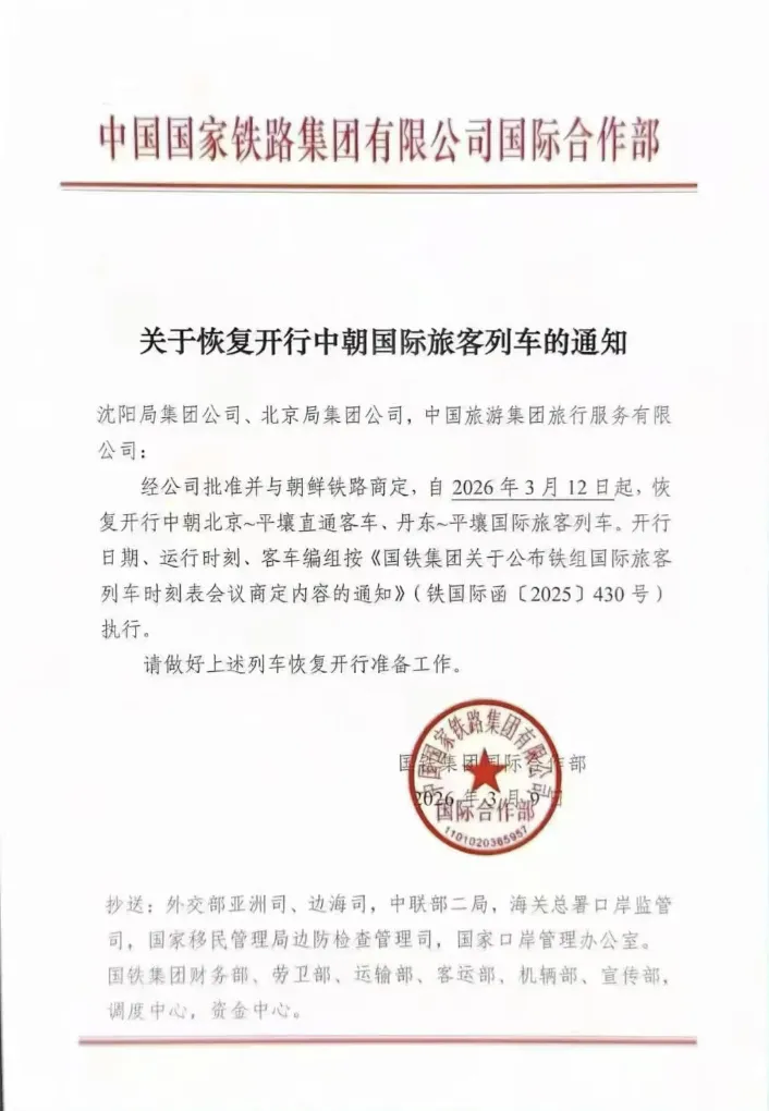 根据国铁集团国际合作部发布的《关于恢复开行中朝国际旅客列车的通知》显示,自2026年3月12日起,恢复开行中朝之间的北京-平壤直通车、丹东-平壤国际旅客列车。