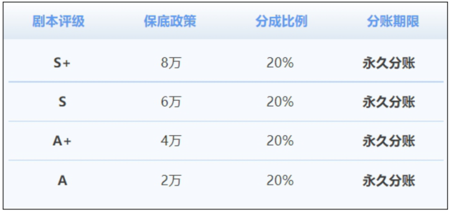 今年1月份,抖音集团短剧版权中心发布新规,仿真人剧本分为S+、S、A+、A四档,对应保底政策分别为8万、6万、4万、2万元,同时统一享有20%的永久分账。
