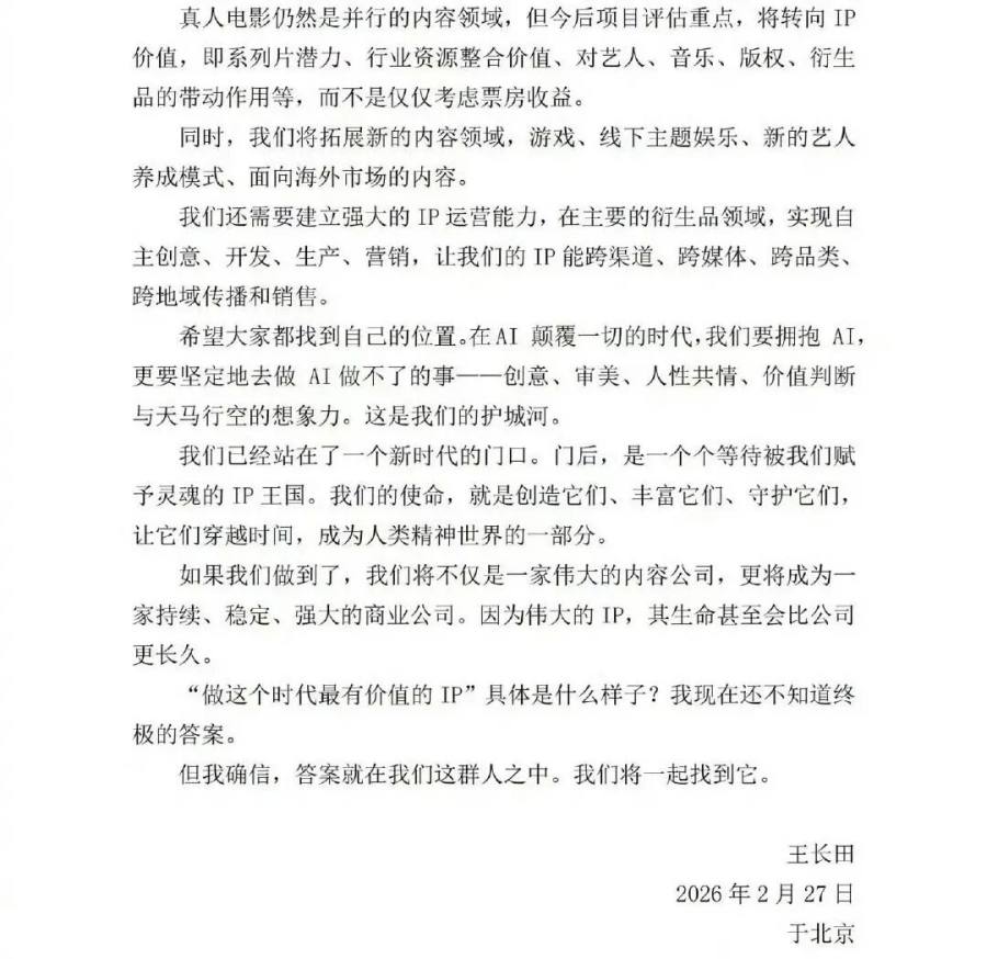 近期,光线传媒董事长王长田发布《致全体同事的一封信》,主题为“一切为了IP”。从“一切为了电影”到“一切为了IP”,光线战略重心的变化,代表着王长田对AI时代的内容判断:在AI颠覆一切的时代,我们要拥抱AI,要更坚定地去做AI做不了的事——创意、审美、人心共情、价值判断与天马行空的想象力,这是我们的护城河。