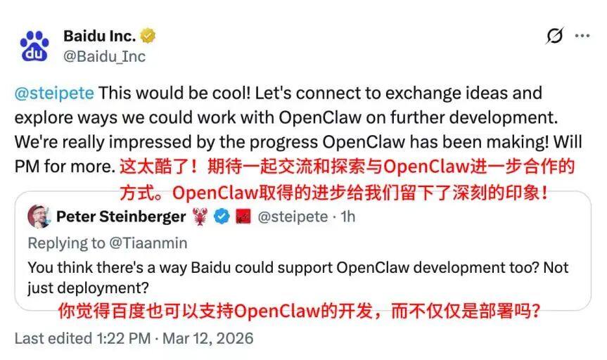 12日11点时许,OpenClaw创始人Peter Steinberger在海外社交平台上连发两条回复,称中国AI创新速度“Amazing”,并表示愿与百度共同开发龙虾,百度第一时间给出回应,期待进一步合作。