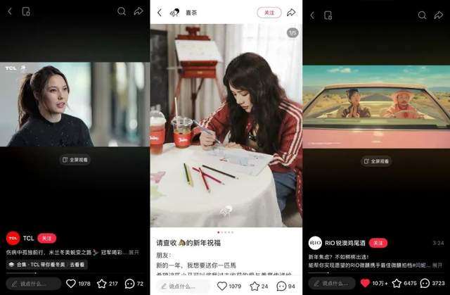 不仅如此,RIO携手闫妮、张兴朝推出的《微醺新年出逃记》品牌剧情片,单条在小红书有10万+点赞;春节期间TCL与谷爱凌共创的纪录片《谷爱凌,再出发》发酵出多个热度话题;喜茶邀请马思纯手绘小马,网友直呼“马年第一夯的奶茶周边出现了”......