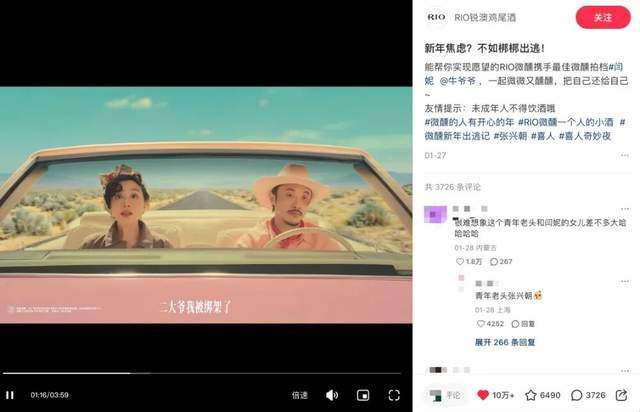 1月底,RIO推出的剧情短片《微醺新年出逃记》中,闫妮与张兴朝上演了一段抽象“绑架戏”,张兴朝饰演的“绑匪”带着被七大姑八大姨围攻的闫妮儿,途中还攻克了亲戚镇、同辈攀比,最终带闫妮抵达目的地——轻松、只属于自己的微醺独处时刻。整支短片的制作质量也极高,堪比电影。