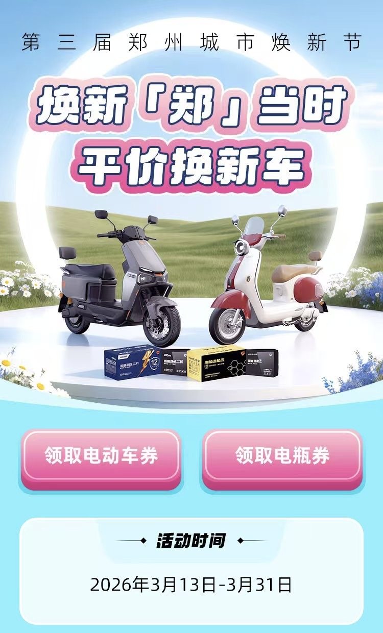 目前,活动已全面开启,有意向升级出行工具的郑州市民,可通过“郑好办”APP准时抢券,把握春日焕新最佳时机,开启便捷、实惠、绿色的出行新生活。