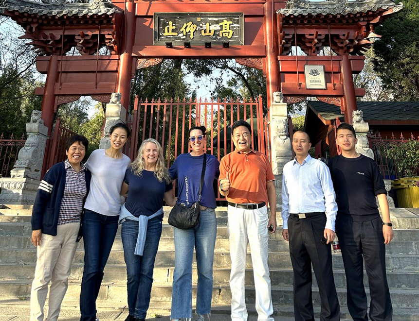 高山仰止景行行止——张国臣、张小羽(左二)向美国佛蒙特法学院院长贝丝.麦科马克(右四)、副院长凯蒂.梅里尔(左三)介绍世界文化遗产嵩阳书院文化(2023年10月王小吾摄)
