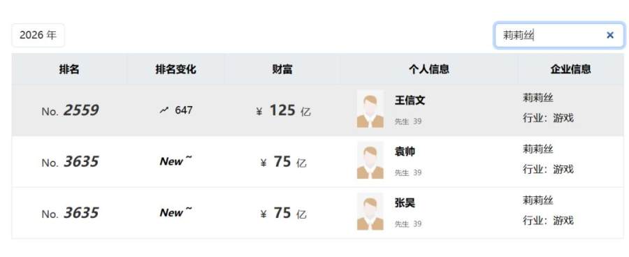 在最新揭晓的《2026胡润全球富豪榜》中,莉莉丝游戏的三位创始人——王信文、张昊、袁帅,齐齐跻身亿万富豪俱乐部,三人财富总和高达275亿元。