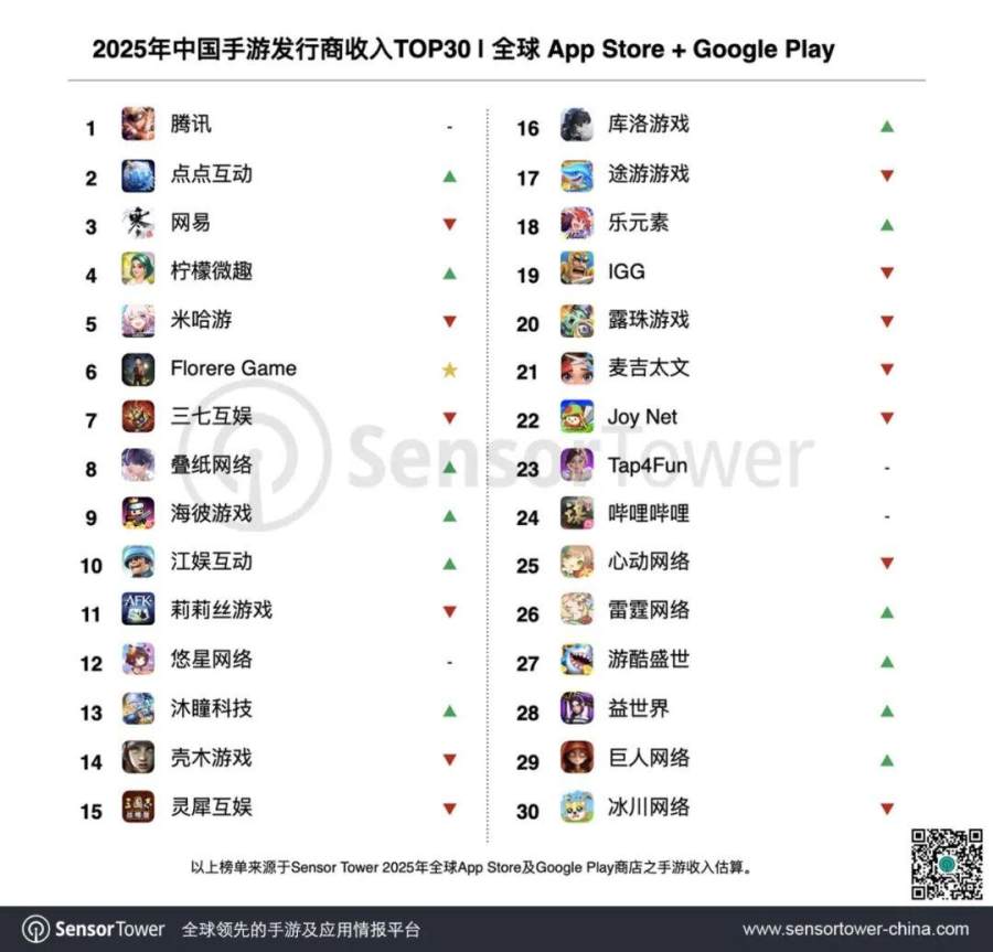 在不久前Sensor Tower发布的2025年中国手游发行商全球收入榜中,莉莉丝的排名从上一年的第5名大幅下滑至第11名,被柠檬微趣、Florere Game、三七互娱、叠纸网络等众多同行反超。
