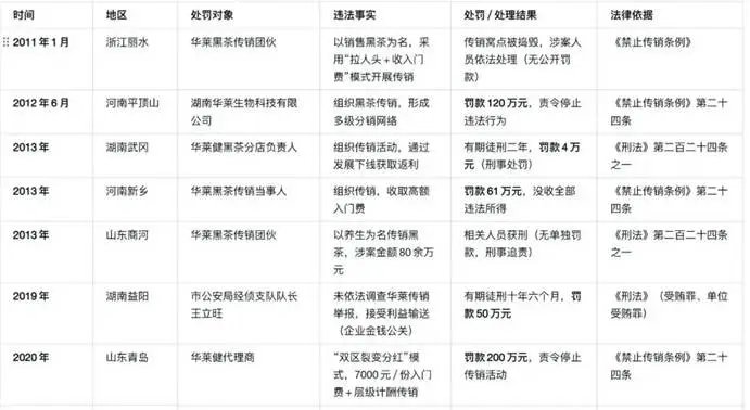 2011年,浙江丽水市工商局经检支队打掉华莱黑茶传销团伙,查处其“拉人头+收取入门费”的行为,揭开其违规经营的冰山一角;2012年,河南平顶山市查处湖南华莱生物传销活动并处以120万元罚款;2020年,山东青岛市华莱健代理因使用“双区裂变分红”传销模式被罚200万元……这些处罚案例屡见不鲜。