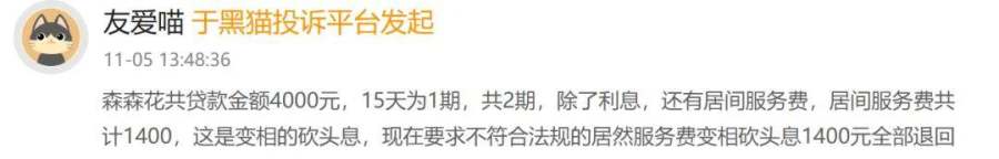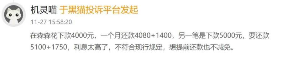 代表性案例便是森森花。多名用户在黑猫投诉上发帖称:在森森花借款6000元,期限一个月,被收取2000元手续费和55元利息,核算下来年化利率远超36%;