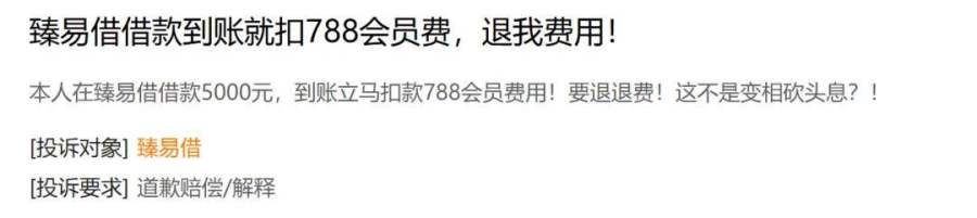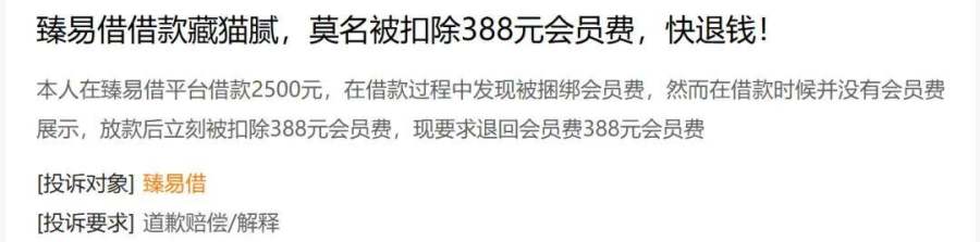 黑猫投诉上,10多条投诉直指臻易借暗藏“猫腻”,即在用户借款时无任何费用提示,放款后却立刻被扣除数百元不等的“会员费”。