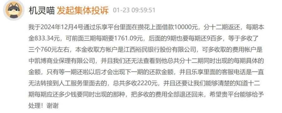 另有消费者在黑猫投诉发起集体投诉:通过乐享借在攒花借款10000元,分12期还款,每期本金833.34元。但前三期每期需还1761.09元,后九期每期900多元,累计多收2220元。本金由江西裕民银行收取,多收费用却进入中凯博商业保理有限公司账户,且还款计划不透明,需还完一期才能看到下期金额。