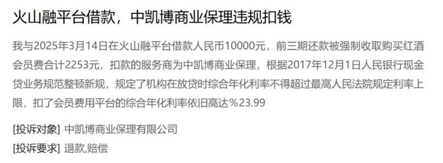 比如,有用户投诉,在火山融平台借款10000元,前三期还款中被强制收取“购买红酒会员费”合计2253元,扣款方为中凯博商业保理有限公司。