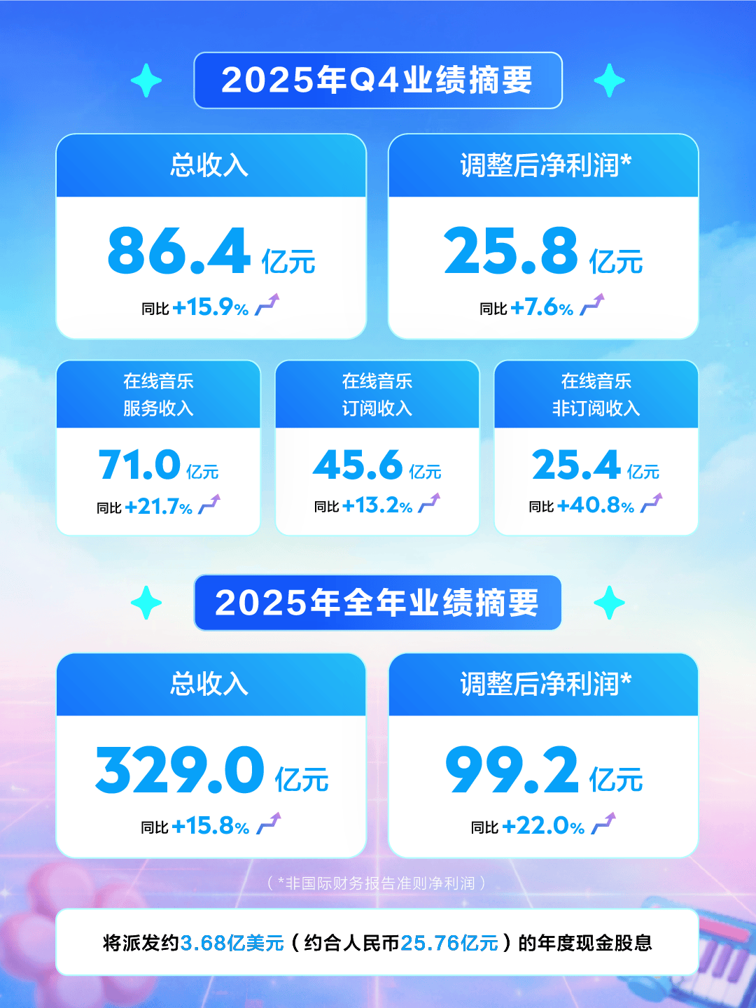 财报披露,腾讯音乐将派发总额约为3.68亿美元的2025财年年度现金股息。